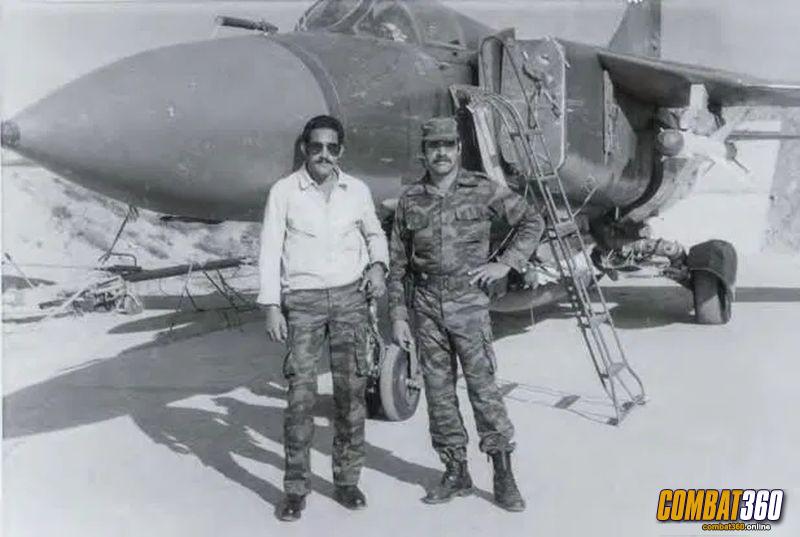 MiG-23 pilot Lino Vieras (left) and a Cuban intelligence officer next to a MiG-23ML at Huambo in April 1986. An R-24T missile is loaded on the jet’s left shoulder pylon