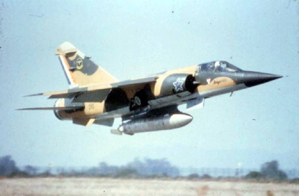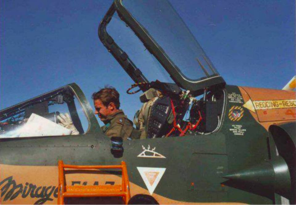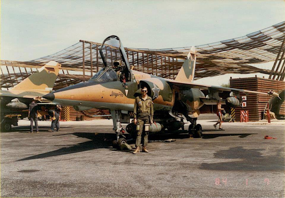 1984 Namibia/South West Africa Angolan Border – A highly regarded officer in The South African Air Force – Jan Henning, is seen here standing in front of his French built Mirage fighter jet. Note the specially designed protective revetment (pen) for these fighters behind him. AFB #Ondangwa #MirageF1