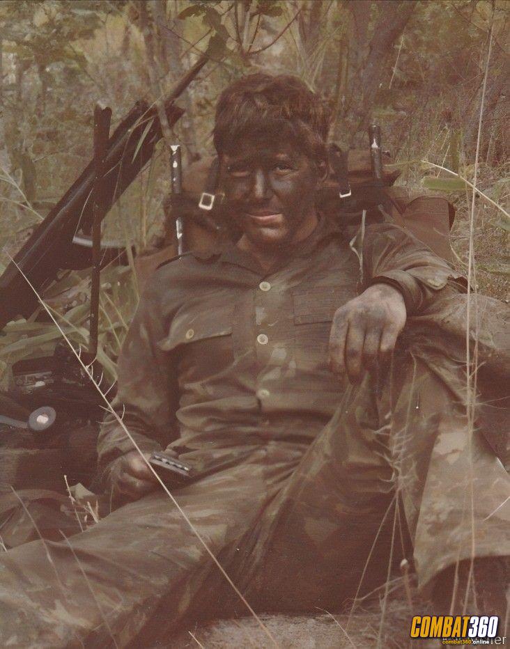 Mac Da Trindade on a patrol break in Angola, he served in E coy and recce wing of 32bn