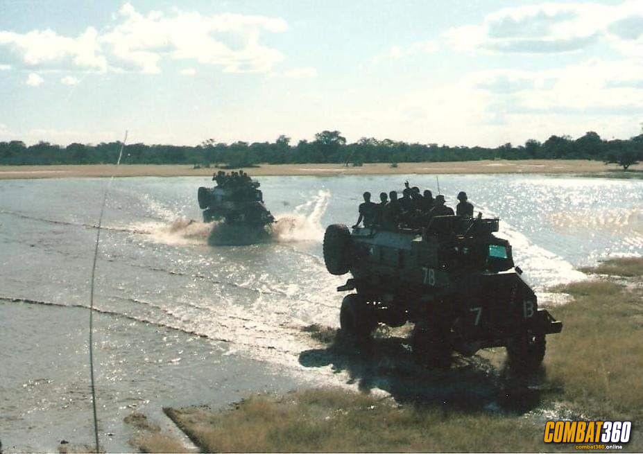 Two Casspirs in every team are equipped with the RPG-7V; Arabic markings on PG-7 warhead indicate Syrian manufacture. Note trooper with South African anti-personnel rifle grenade constructed by using body of M26 hand grenade and attaching it to base fuze assembly and finned tail unit.