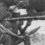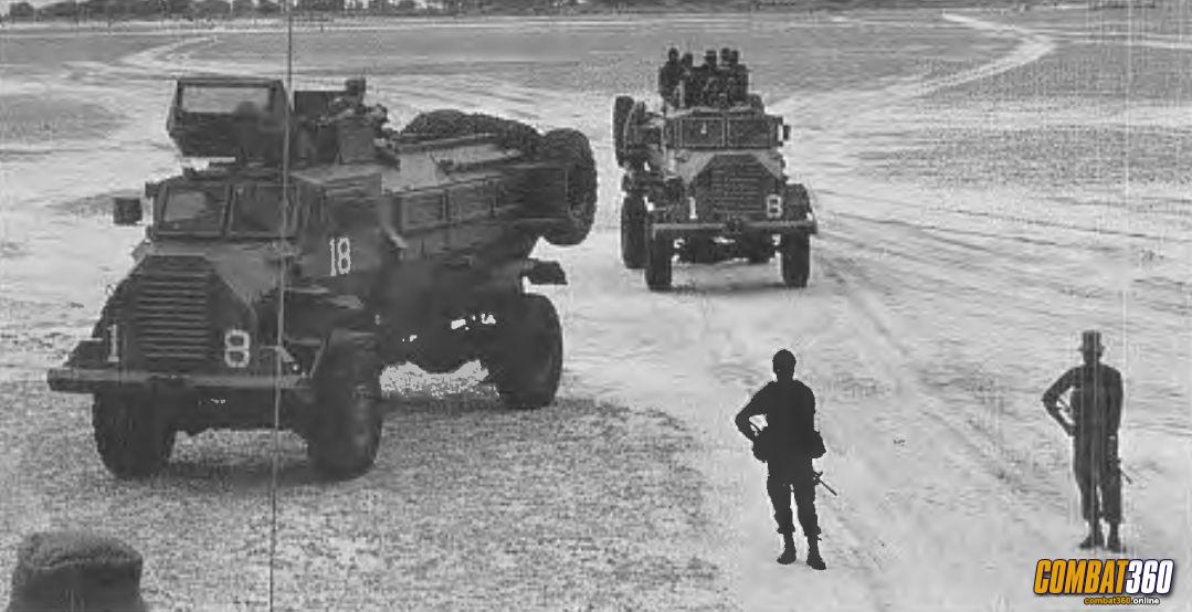 Two Casspirs in every team are equipped with the RPG-7V; Arabic markings on PG-7 warhead indicate Syrian manufacture. Note trooper with South African anti-personnel rifle grenade constructed by using body of M26 hand grenade and attaching it to base fuze assembly and finned tail unit.