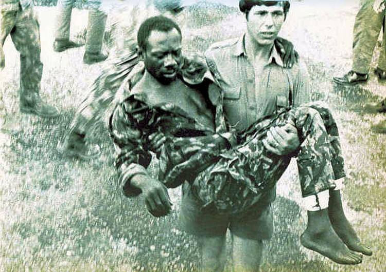 White Portuguese troopie carrying a wounded African comrade in Mozambique, 1970.