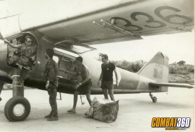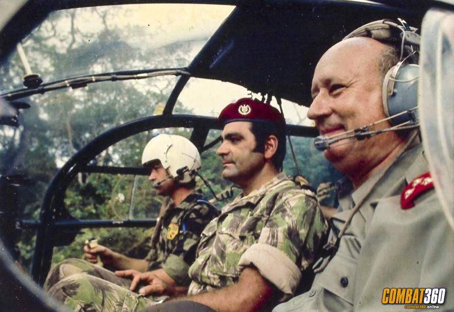 Founder and first commanding officer of the Grupos Especiais Pára-quedistas, Colonel Costa Campos wearing the red beret of the GEP, sitting alongside the Commander in Chief of forces in Mozambique, General Kau?lza de Arriaga in an Alouette III helicopter.