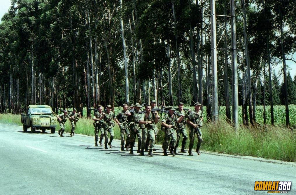 Rhodesian Light Infantry Recruit Course jogs by, hauling along 26 pound FN MAG machine guns in the extreme Rhodesian heat near Cranborne Barracks, circa. 1976