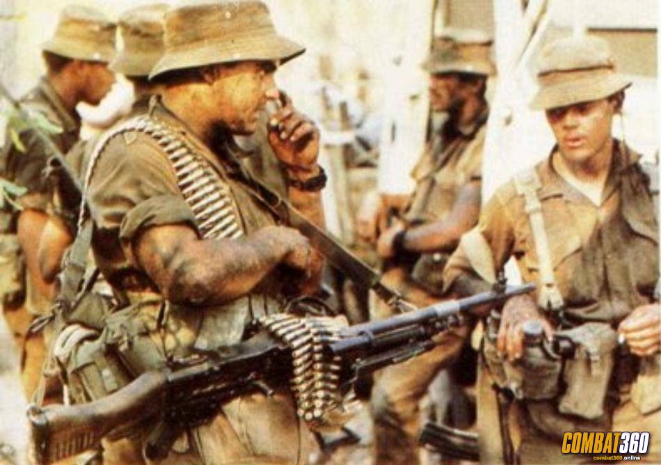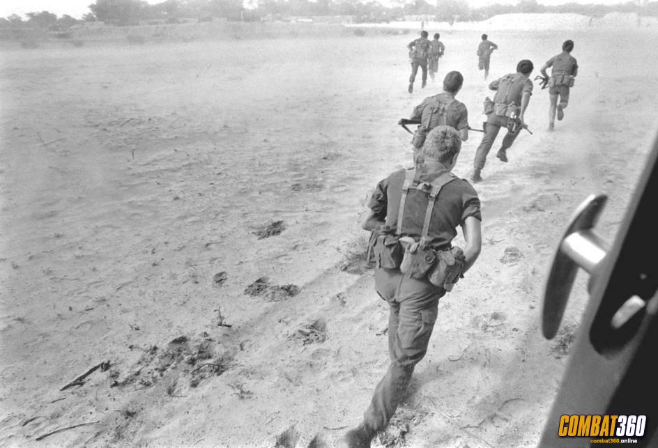 South African rapid response unit is debused from a South African Air Force Puma helicopter somewhere on the Angolan and South West African/Namibian Border. Great photo by Peter Marlow