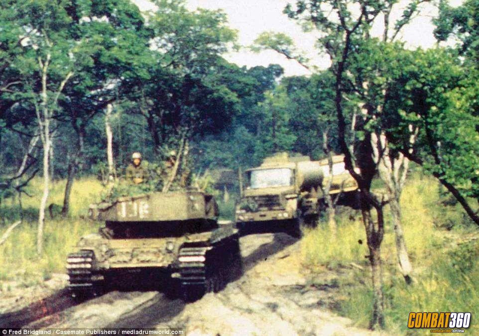 South African Olifant tanks are pictured moving up to the frontline prior to a major battle near Angola’s Cuito River in the late 1980s