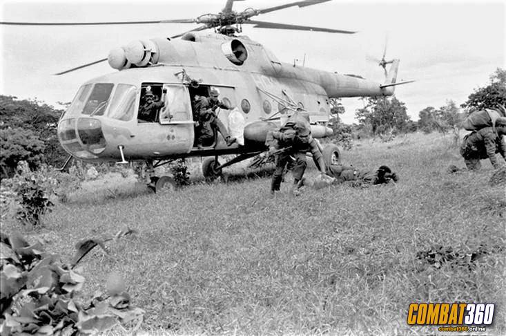 Cuban soldiers jumping from an Mi-8 helicopter landing in Angola, 1982.
