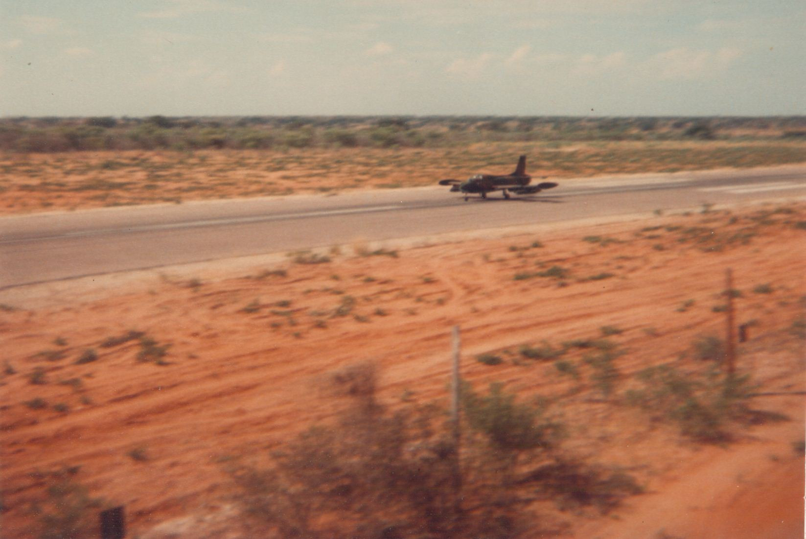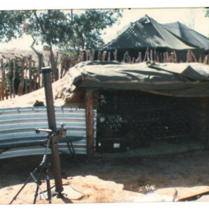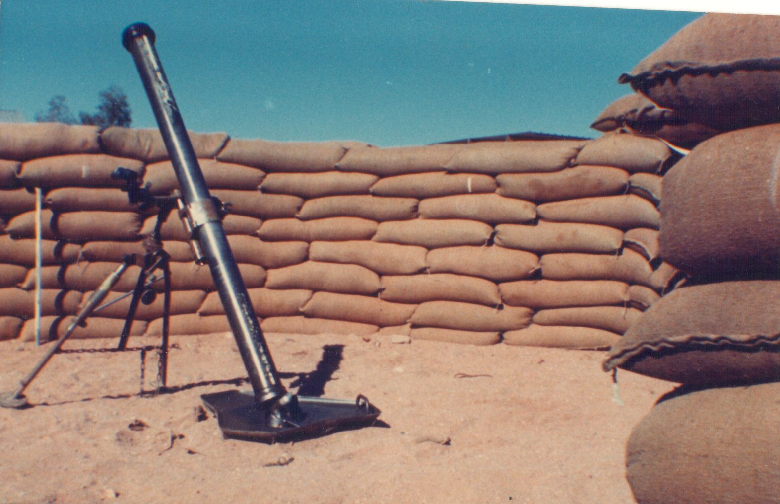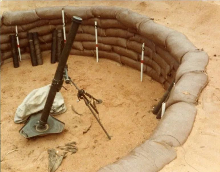 The 81 mm Mortar Pit at #Rundu. The sand had the same composition as beach sand, requiring the sides of the pit to be secured with sandbags. Note the numbered ‘rigtings palings’ (directional poles). These allowed the ‘Number 1s’ on the gun to bring the weapon quickly into action and to fire on predetermined targets