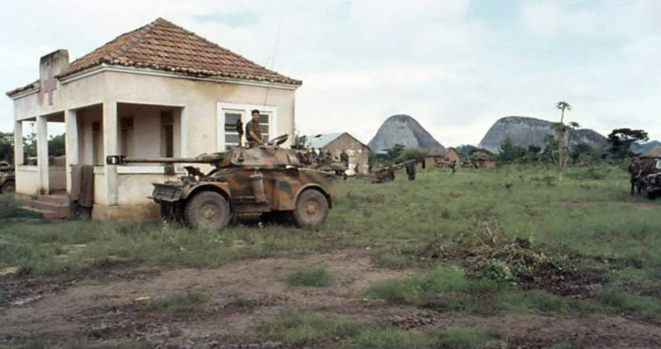 Operation #Savannah 1975, this rare photograph taken deep into Angola of a SADF #Eland-90 Armoured Car of Combat Group Foxbat at the Re-Supply point at the abandoned Clinic at Santa Comba. Note the 25 pounder field gun in the background, also note the strikingAngolan landscape south of the country’s capital Luanda.