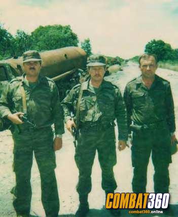 Adviser to the chief of artillery of the 10th Inf Brigade under the command of Y Yatsun, advisor to the commander of the 10th Inf Brigade under the command of V Sagatchko, advisor to the chief of air defence of the 8th Inf Brigade under the command of V Romanov. In the background is a destroyed FAPLA fuel truck ambushed by UNITA