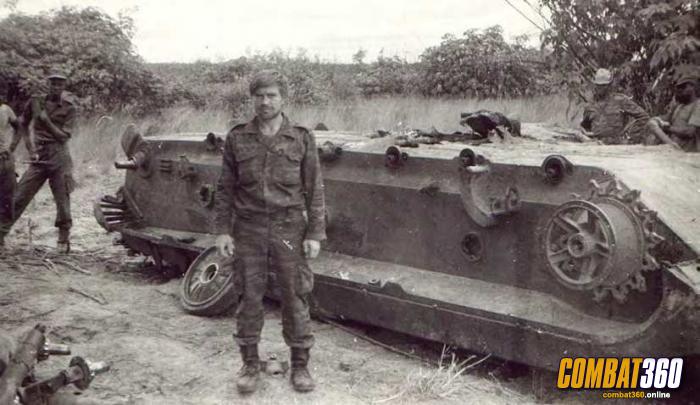 Soviet military adviser Major V Gavrilov with a damaged BMP-1 after fighting in the province of Moshiko