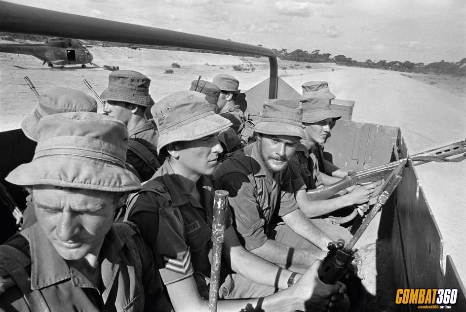 South African patrol travelling in an ‘Buffel’ anti-mine armoured troop carrier near the Angolan South West Africa/Namibia border.