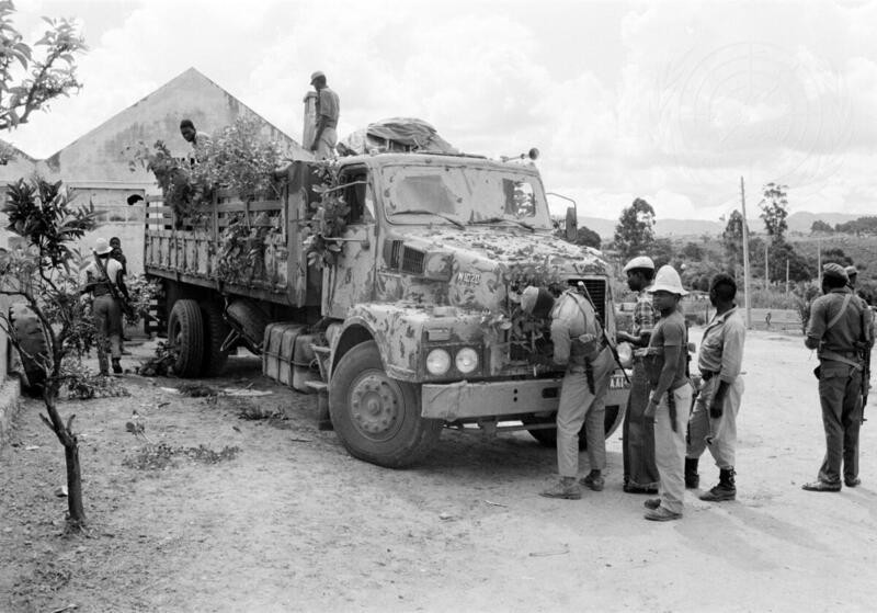 South West Africa People’s Organization (SWAPO) troops in Angola use brush to camouflage a lorry carrying weapons and ammunition near the Namibian border. Detachments like these penetrate Namibian territory to engage South African forces.