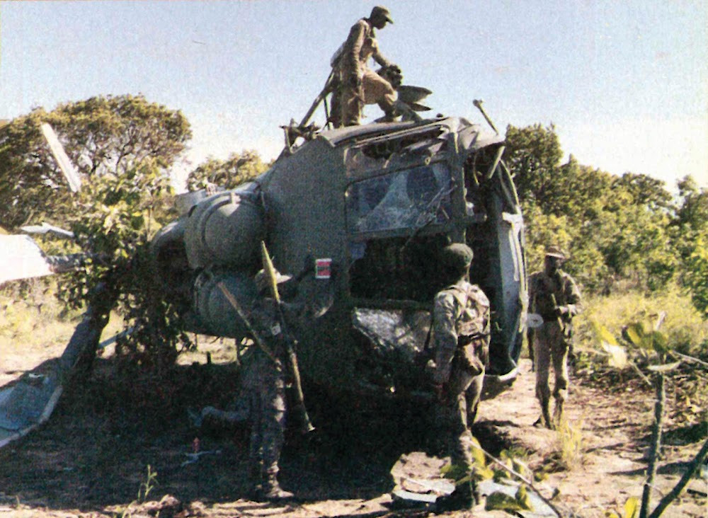 #UNITA Troops clamber over an Angolan Air Force, Russian built #Mi-8 assault helicopter shot down during the battles. This helicopter is codenamed Hip by NATO. @jonas-savimbi