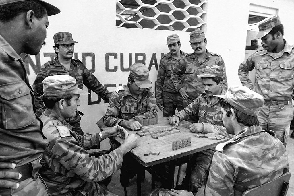 Angolan, Soviet and Cuban soldiers pose for a photograph near Cuito Cuanavale in April 1988