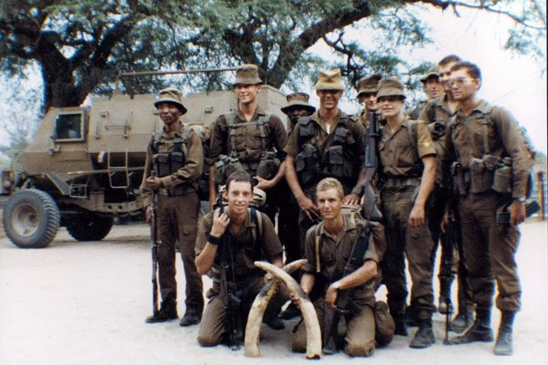 South African Marine Corps during the Angolan War with a Buffel MRAP in the back