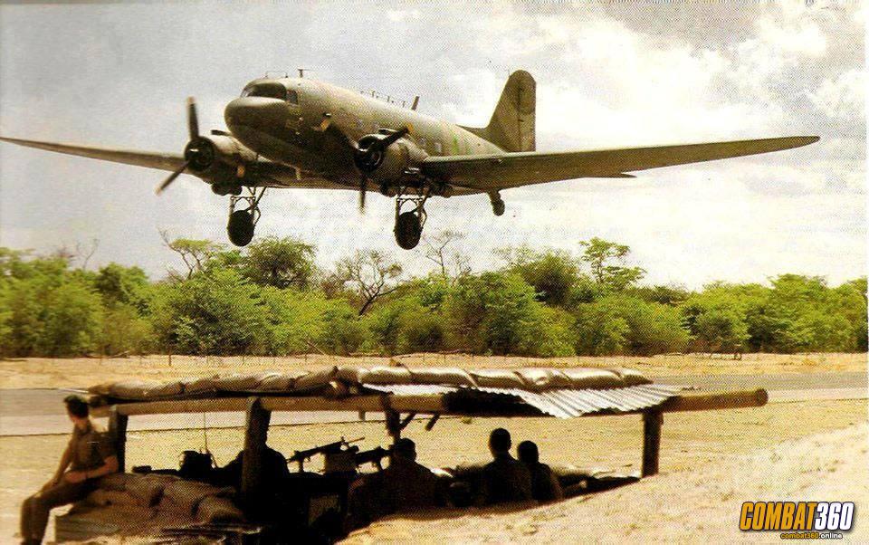 Border War. Iconic photograph taken by the late great Herman Potgieter of a South African Air Force C-47 Dakota from 44 Squadron, taking off opposite a defence bunker near the runway threshold at Eenhana, South West Africa/Namibia.